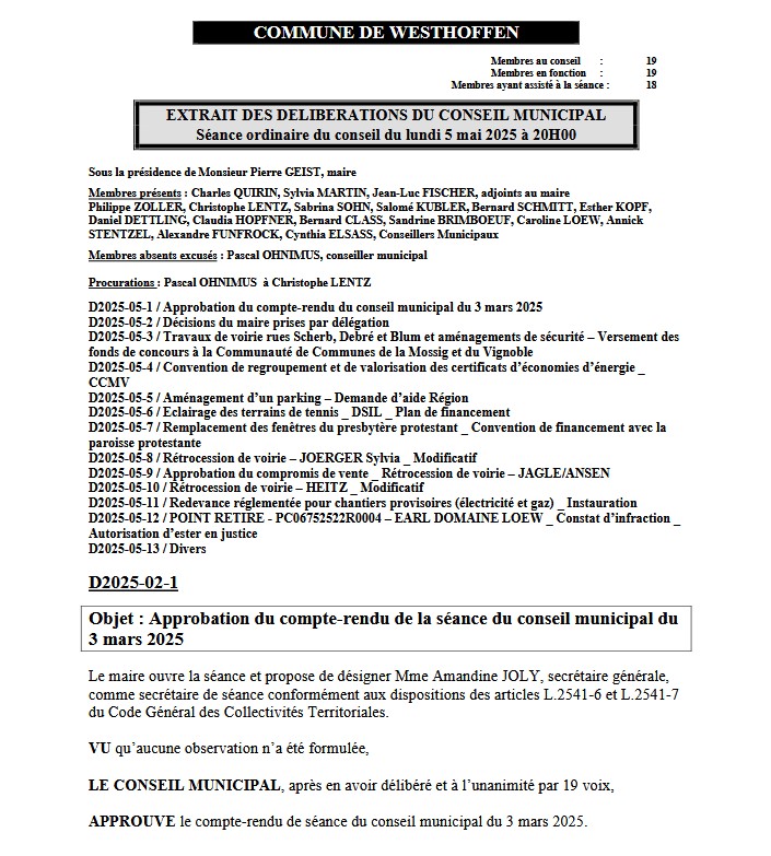 Le compte-rendu du conseil municipal (séance du 5 mai 2025) est désormais disponible en ligne. Pour le consulter directement, cliquez sur l’image ci-dessous. Pour rappel, l’ensemble des comptes-rendus du conseil sont disponibles ici